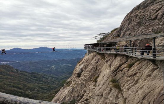 景区内古木参天、佳景深藏,集奇松、峻石、云海、瀑布于一体,为了给游客带来全新的旅游体验,明堂山高空栈道由绝壁栈道、玻璃栈道、玻璃屋、玻璃眺望台及玻璃桥构成,形成了“四面看景”的独特风光。